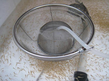 (あまり小さい稚魚は、出てしまうが・・・後で救ってやる)